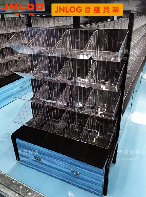 隨著現在生活節奏的不斷加快,人們生活水平的不斷提到,各種琳瑯滿目的零食已經不再是小孩在們的專利,許多成年人也是開始購買各種零食。零食的購買量的增加,也使得不少的零食點逐步的增加,需要更多的零食展架。今天晉隆小編給大家介紹下一款用于零食擺放的中島零食柜,用于擺放各種零食。